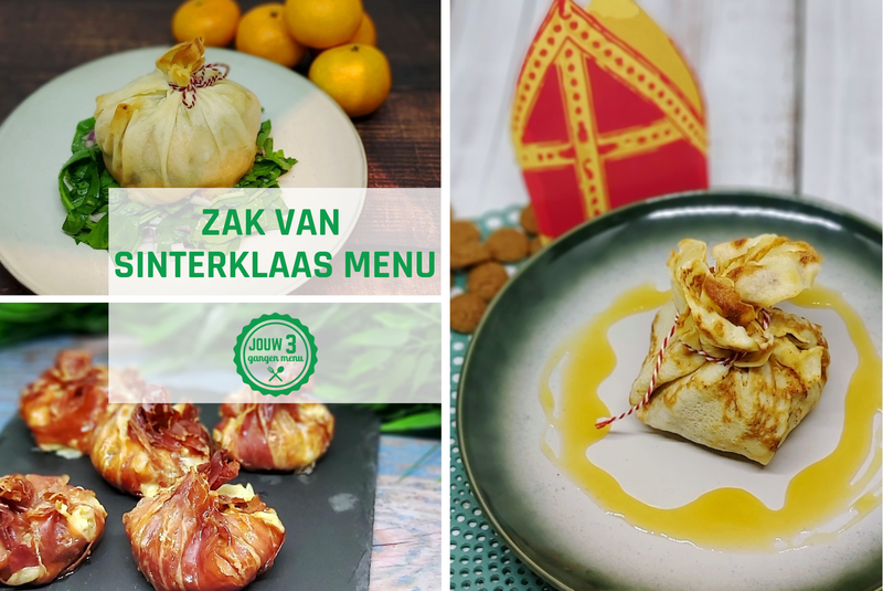 Sinterklaas is in het land, tijd voor een lekker Sinterklaas menu. Dit keer besloot ik 3 keer een zak van Sinterklaas te maken. Zakken van verschillende ingrediënten en natuurlijk niet gevuld met cadeautjes, maar met heerlijk eten. Alhoewel een lekker bord eten soms toch wel echt als een cadeautje aan kan voelen ;)