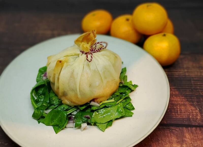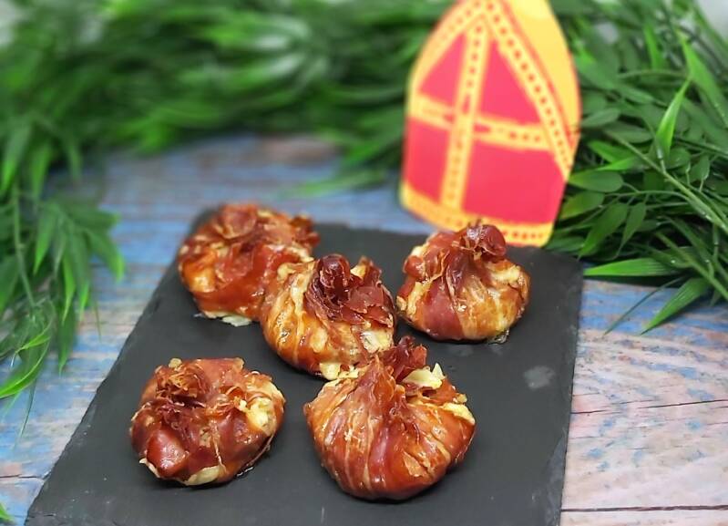 Je begint met een zakje van Spaanse droge ham, gevuld met witlof en kaassaus. Een traditioneel gerecht dus, in een nieuw jasje (of zakje) gestoken. Een Spaanse ham, zoals iberico- of serranoham past natuurlijk goed bij het Sinterklaasthema, maar je kan ook Italiaanse prosciutto gebruiken. Voor het hoofdgerecht gaan we aan de slag met mandarijnen, want die kunnen niet ontbreken tijdens Sinterklaas. Je combineert ze met zalm en aardappelpuree, in een zak van filodeeg. Klinkt misschien gek, maar dat is een hele lekkere combinatie!
