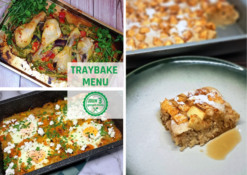 Doordeweeks eten we regelmatig traybakes. Lekker makkelijk, want de oven doet het meeste werk. Gewoon alles op een bakplaat leggen, door elkaar husselen met wat olie en kruiden en in de oven schuiven. Voor je het weet zit je lekker te eten. En dat is natuurlijk ook handig voor een etentje. Daarom bedacht ik een voor-, hoofd- en nagerecht traybake.