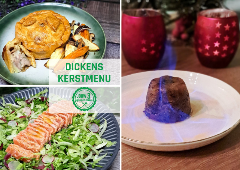 Je start met een salade met ingemaakte zalm, een lichte en frisse start van het menu. Dat is wel nodig, want het hoofd- en nagerecht zijn behoorlijk vullend. Als hoofdgerecht maak je namelijk een Leicestershire pork pie. Een heerlijke hartige taart die gevuld is met varkenskarbonade en speklapjes. Het deeg is lekker kruimelig en je proeft de roomboter erin terug. Je serveert er een traybake van wortel, pastinaak, appel en champignons bij. Het toetje zijn Engelse plum puddings, die in het boek 'A Christmas Carol' van Dickens voor het eerst Christmas puddings genoemd werden. Je maakt ze van gedroogd fruit, zoals rozijnen, krenten en cranberries. Om het etentje in stijl af te sluiten kun je de puddings bij het serveren flamberen met cognac of brandy.