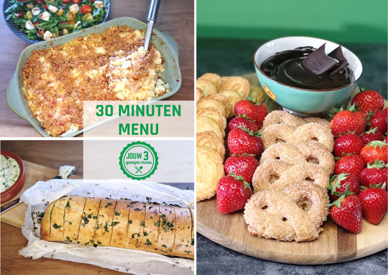 Je kan dit hele menu dus in ongeveer 30 minuten maken, voorbereiding is daarom niet nodig. Je moet wel 30 minuten lang achter elkaar doorwerken of om een beetje vragen. Zorg ook dat je alle ingrediënten en de overige benodigdheden vast klaarzet. Dan hoef je niet te zoeken of af te wegen tussendoor en kan je snel doorkoken. Je vindt op deze pagina meteen het recept voor het hele menu. Wil je maar 1 onderdeel van het menu maken? Klik dan hierboven op de foto van het gerecht of hieronder in de tekst op de linkjes voor het losse recept.