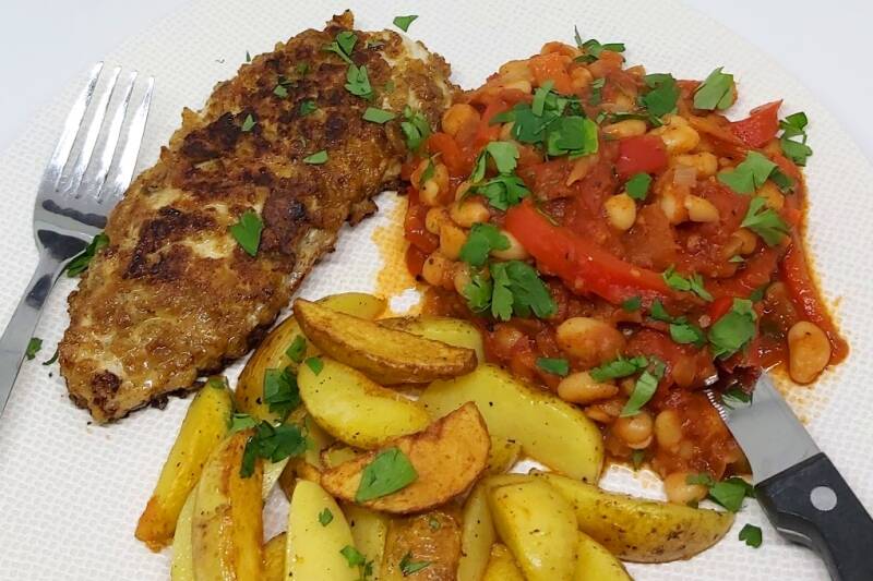 Na het voorgerecht bak je de schnitzels en aardappels gaar en warm je de witte bonen in tomatensaus op: