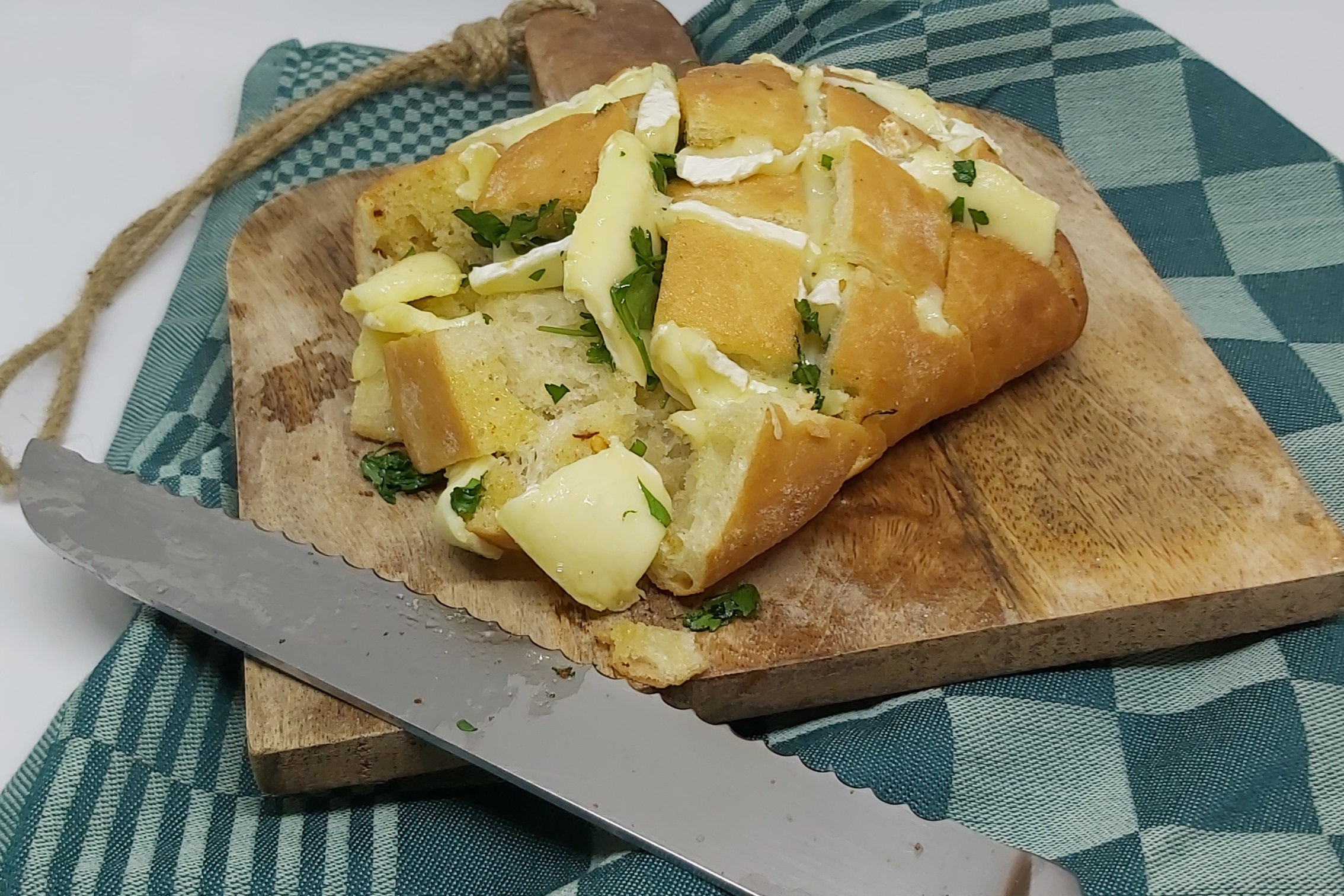 De eerste gang is een lekker borrelbrood met chiliboter, peterselie en brie: