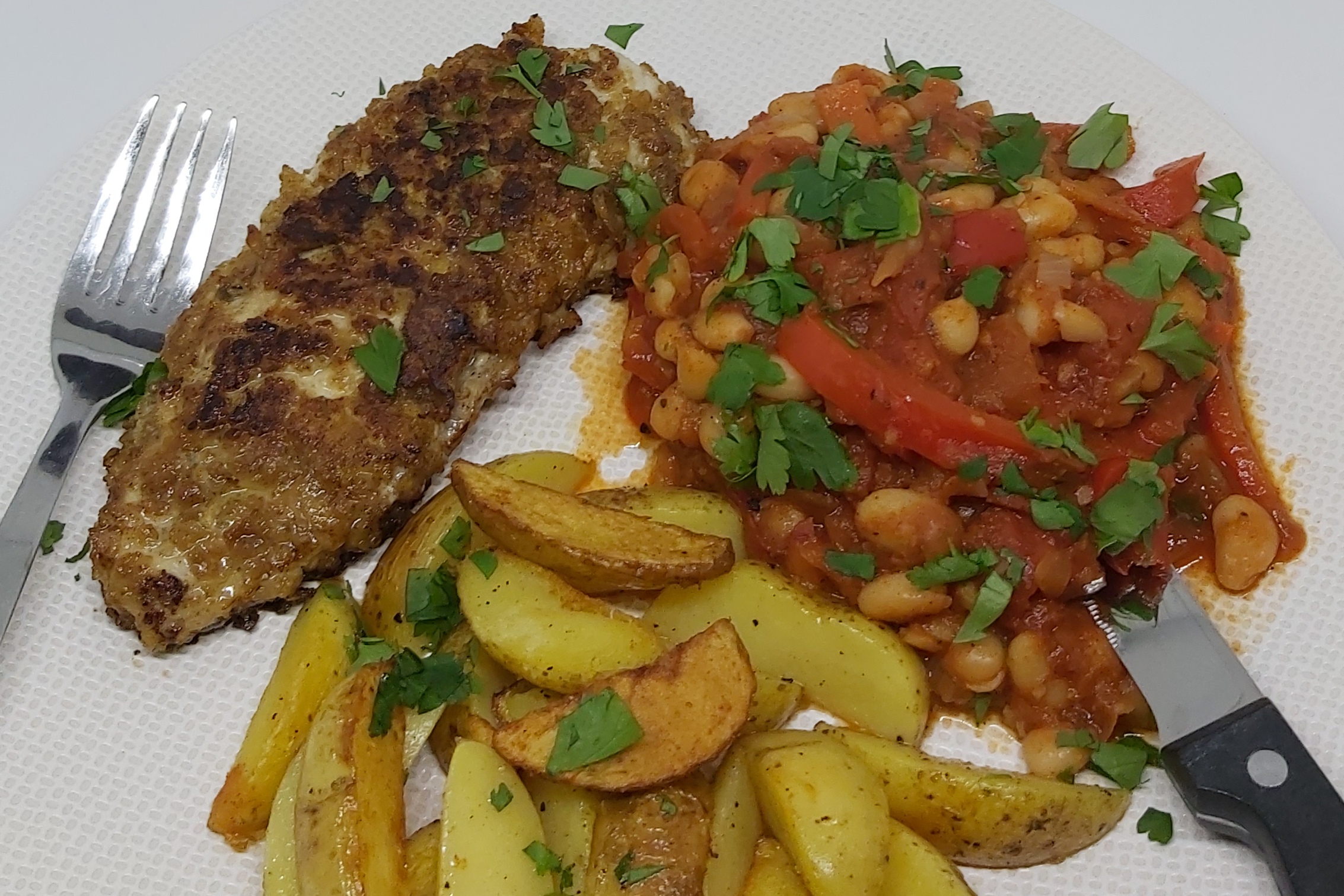 Witte bonen in tomatensaus met crispy schnitzel