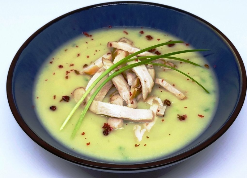 - De bieslook roer je er op het laatste moment doorheen. Schep de soep in borden en leg er een schep kipreepjes en per bord 2 takjes bieslook op. Ik strooide er ook nog wat gevijzelde roze peper overheen. Je kan ook gewone peper of cayennepeper gebruiken voor wat kleur.