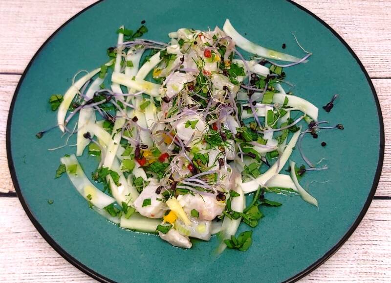 Als tweede bereid je de ceviche voor. Ceviche is eigenlijk rauwe vis, maar door het te marineren in een zure dressing van bijvoorbeeld citroensap wordt de vis gegaard. Daarom kan je het wel voorbereiden, maar pas op het laatste moment afmaken, anders wordt de vis veel te gaar.