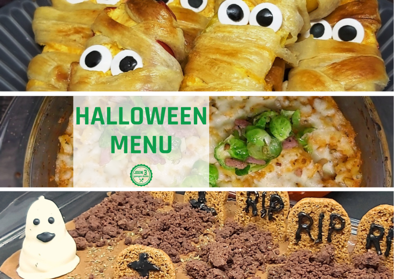 Dit menu is leuk om met kinderen te eten, maar ook gewoon heel lekker voor volwassenen. Je start met gevulde paprika mummies. De paprika's zijn gevuld met een lekker kaasmengsel en omwikkeld met croissantdeeg. Dan het hoofdgerecht, een heerlijke pasta met pompoen en spruitjes. Het lijkt een beetje op Mac'n'Cheese. Met behulp van de spruitjes maak je een leuk Halloween-hoofd op de pasta.