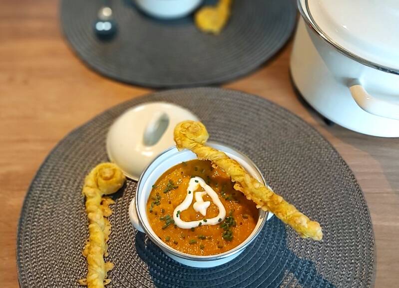Het voorgerecht is een lekkere galette, met tomaten en kaas, in de vorm van een mijter. Daarna serveer je hete bliksem, een oerhollandse stamppot met appeltjes. En van gewone appels gaan we naar de appeltjes van oranje, met een heerlijk mandarijncakeje met kruidnootjes.