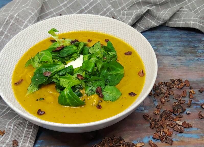 Lees hier precies hoe je de zoete aardappelsoep met cacaonibs maakt >>