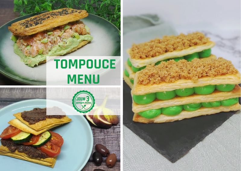 Je start dit menu met een vegan tompouce van filodeeg, gevuld met een tapenade van olijven en vijgen. Heerlijk met wat geroosterde groenten. Dan maak je een bladerdeeg tompouce met sesam en zalmtartaar. Serveer hem met een lekkere salade en je hebt een heerlijk hoofdgerecht. Als toetje gaan we voor een Franse tompouce, namelijk de mille feuille. Gewoon een tompouce met een extra laagje bladerdeeg. Je vult hem met pandanroom en maakt hem af met heerlijk zoete kokos.