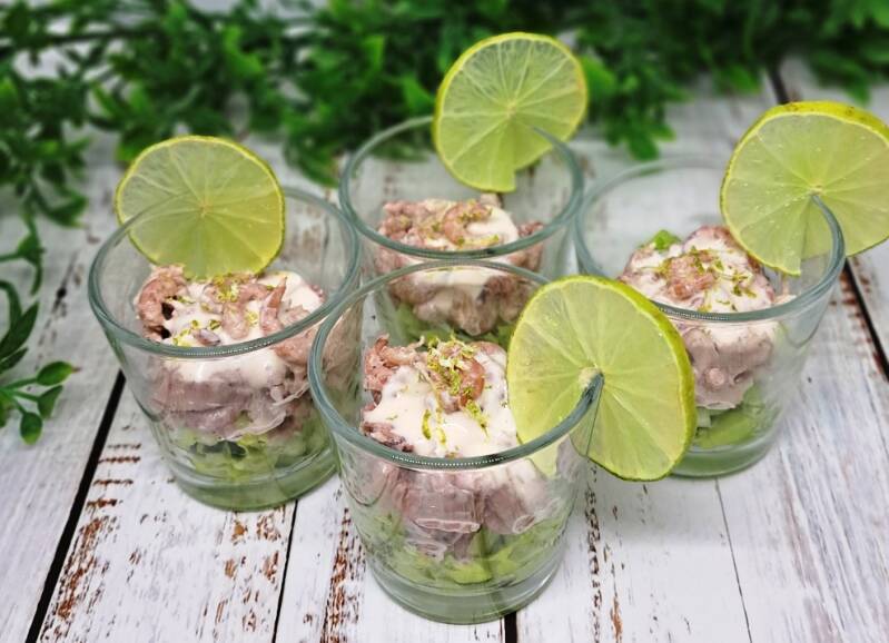 - Klop de slagroom lobbig en schep voorzichtig door de saus, zodat het romig en luchtig wordt. Breng op smaak met limoensap, peper en zout.
