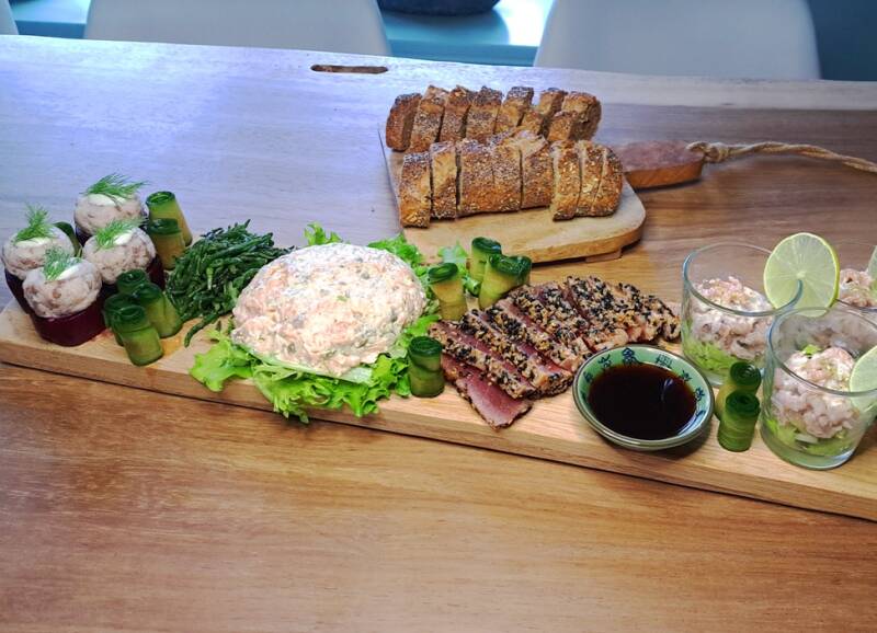 Deze plank staat vol met heerlijke visgerechten, ze smaken net zo goed als eruit zien! Je maakt zalm rilette, gerookte makreel op bietjes, garnalen cocktail en tonijn tataki. Dat serveer je met gemarineerde komkommer, zeekraal en stokbrood.