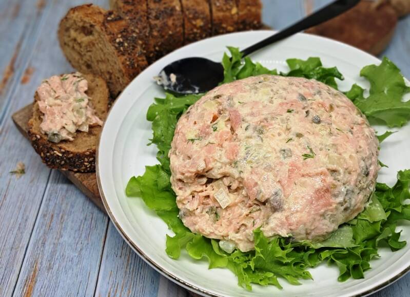 - Doe de zalm rilette in een kommetje en druk aan. Dek af en zet in de koelkast, zodat de smaken goed op elkaar inwerken en het wat op stijft.