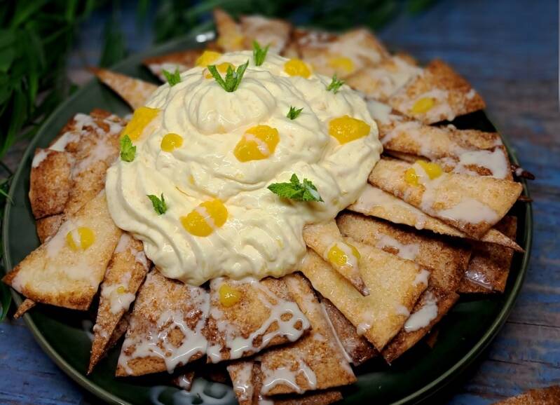 - Serveer de schaal midden op tafel met de rest van de kiwi salsa er los bij.