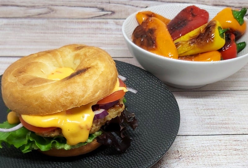 Zin in een lekkere burger? Leg hem eens op een bagel in plaats van op een gewoon hamburgerbroodje. Ik maakte er een Mexicaanse kipburger met guacamole en cheddarsaus van. Daar serveerde ik een soort pimientos de padron bij, maar dan gemaakt van snoeppaprika's, heel lekker en ziet er ook nog eens mooi kleurrijk uit!