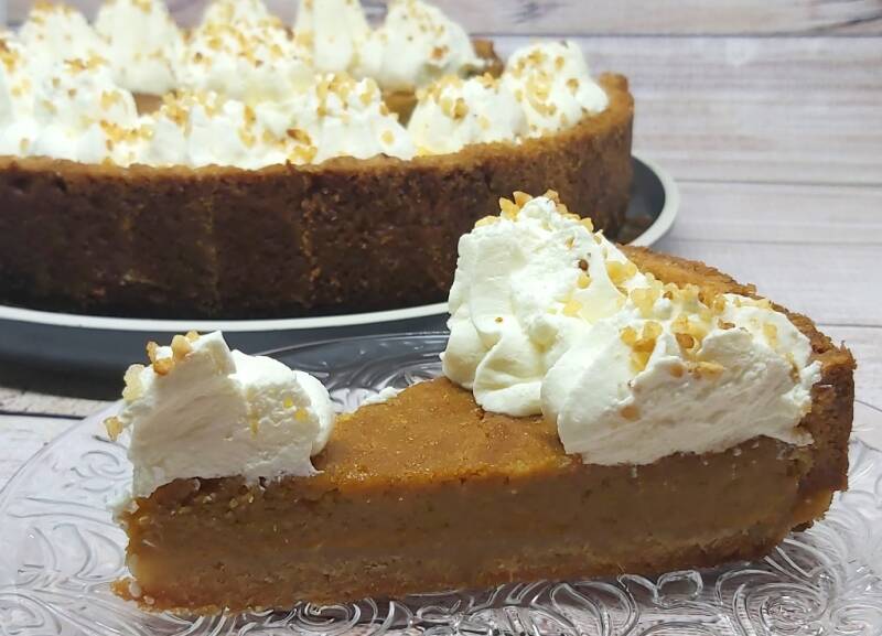 Je vult deze charlotte met een mengsel van pompoenpuree, slagroom en roomkaas en brengt het op smaak met speculaas en vanille. Daarna maak je hem af met een heerlijke speculaas karamel. Ik besprenkelde de taart alleen met wat karamel, maar je hebt genoeg om er een hele laag karamel op te gieten. Ook erg lekker!