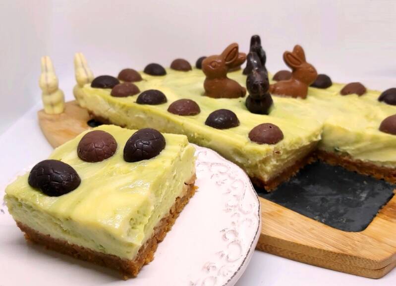 Deze cheesecake is heerlijk zoet en past perfect bij Pasen, dankzij de lichtgroene kleur van de matcha. Afgemaakt met paaschocola zet je een mooie taart op tafel. Ik maakte de taart als onderdeel van het Paasmenu. Doordat je deze een dag van te voren al kunt maken heb je er tijdens het diner geen werk meer aan.