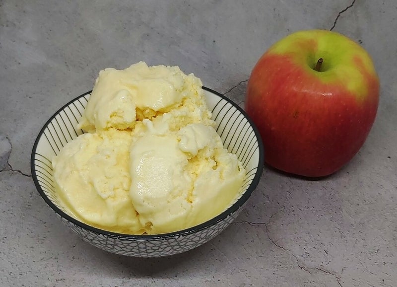 Dit appelroomijs is een van mijn favoriete ijssoorten die ik heb gemaakt sinds ik deze ijsmachine heb. Het is lekker romig met een subtiele appelsmaak. Eigenlijk maak je gewoon een basisroomijs van eidooiers, melk en slagroom. Daar voeg je appelmoes aan toe en de ijsmachine doet de rest.