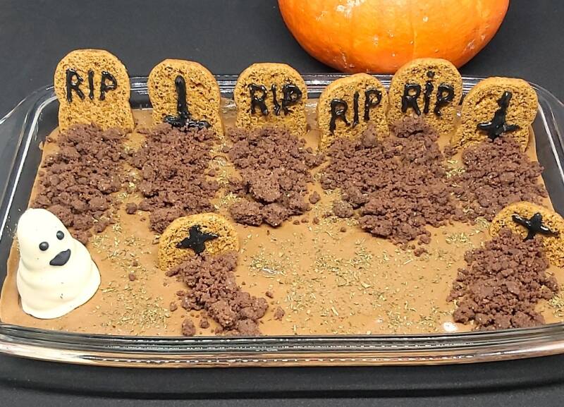 Dit is de beste begraafplaats die er is, namelijk gemaakt van chocola :) Een leuk gerecht voor jouw Halloween diner. De basis is een lekkere chocolademousse. Je maakt de grafstenen van speculooskoekjes en de grafjes zelf van een chocoladecrumble. Voeg die pas vlak voor het serveren toe, zo voorkom je dat de koekjes en crumble zacht worden.