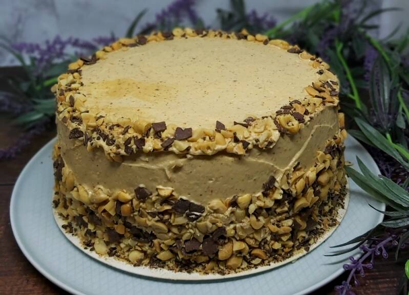 - Besmeer de zijkant en bovenkant van de taart met ongeveer een derde van de chocoladecrème en zet tenminste een uur in de koelkast. Bewaar de rest van de chocoladecrème ook in de koelkast.