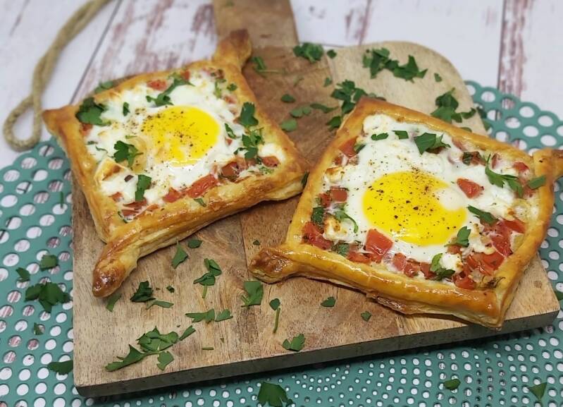 Ei nummer 3 zit in een lekker krokant bakje van bladerdeeg. Lekker met wat stukjes tomaat, geitenkaas, paprikapoeder en verse peterselie. Of gebruik jouw favoriete kaas en kruiden.