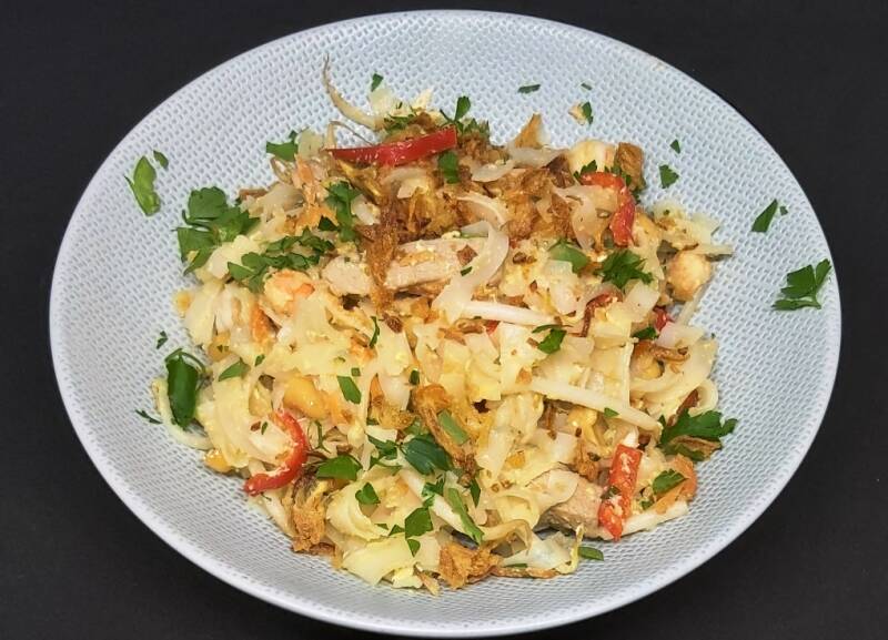 - Doe de groenten in een kom en roer door elkaar. Snij de miehoen in stukjes en roer erdoor. Trek de zalm met 2 vorken uit elkaar en voeg ook toe aan de groenten.
