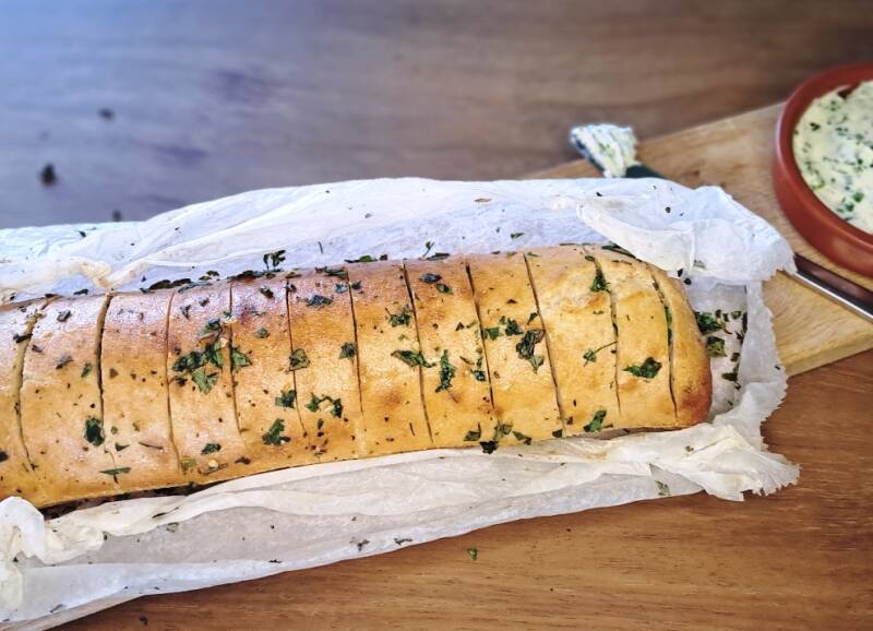 Dit knoflookbrood is een heerlijk voorgerechtje of snack bij een wijntje. Het is net even lekkerder dan gewoon brood met kruidenboter, doordat je het brood insmeert met olijfolie, verse kruiden en knoflook. Je maakt het supersnel met een kant-en-klare ciabatta. Of gebruik een afbak ciabatta die je van te voren afbakt en af laat koelen.