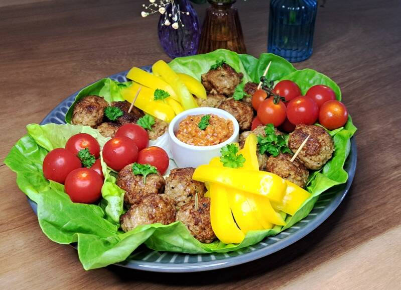Deze gehaktballetjes bestaan voor een deel uit couscous, waardoor ze lekker luchtig zijn en een stuk minder vlees bevatten dan gewone gehaktballetjes. Ze zijn heerlijk gekruid met peterselie, paprikapoeder, komijn en nootmuskaat. En dat kruidige combineert dan weer heel goed met zoete muhammara als dipsaus.