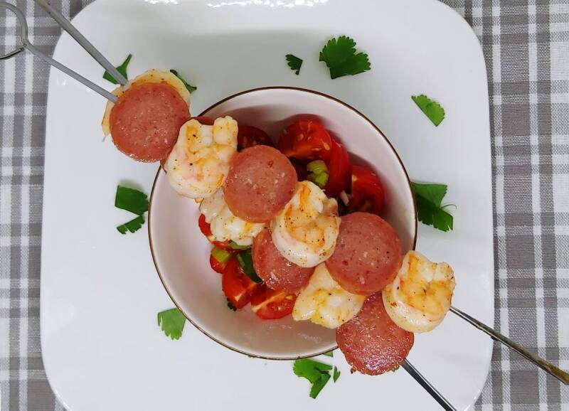 Deze spiesjes zijn een lekker licht en zomers voorgerechtje: garnalen, cervelaat en een salsa van cherrytomaatjes. Makkelijk in de oven te maken, maar ook perfect voor op de BBQ. Je kan gewone cervelaat gebruiken, maar ik ging voor de kip cervelaat van Stegeman. Scheelt toch weer wat calorieën en vetten…