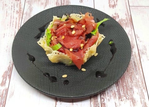 - Vul de parmezaanbakjes met sla en leg daar bovenop de carpaccio. Bestrooi met pijnboompitten en besprenkel met balsamico.