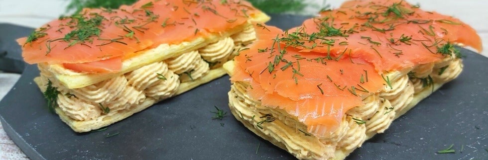 - Smeer een dun laagje cream cheese op 2 van de plakjes bladerdeeg en leg daar de zalm bovenop.